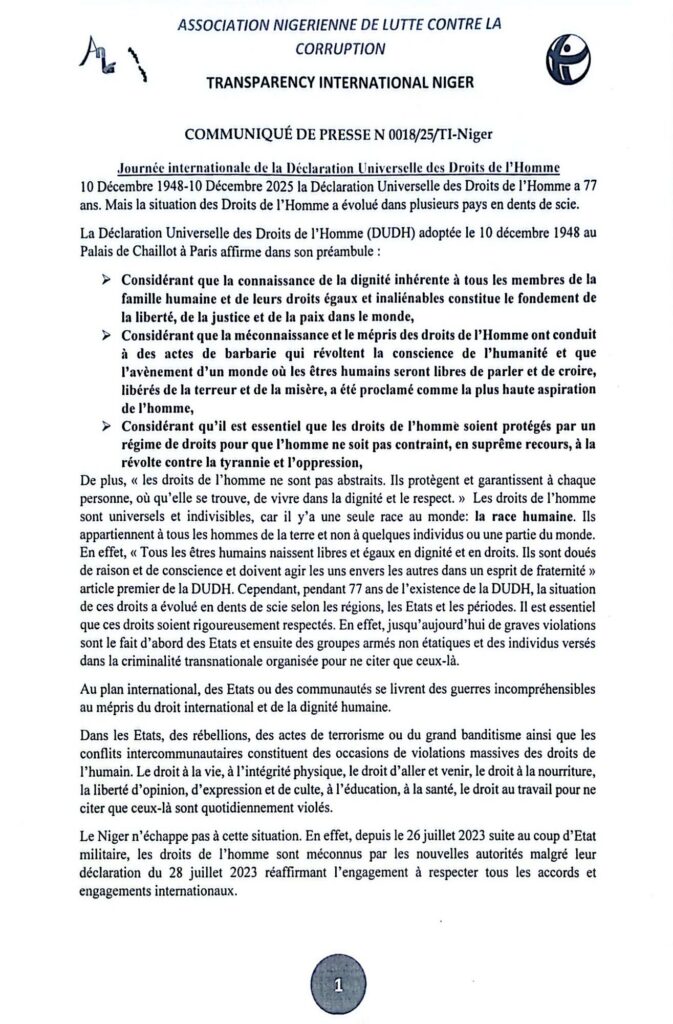 COMMUNIQUÉ DE PRESSE N 0018/25/TI-Niger à l’occasion de la Journée internationale de la Déclaration Universelle des Droits de l’Homme