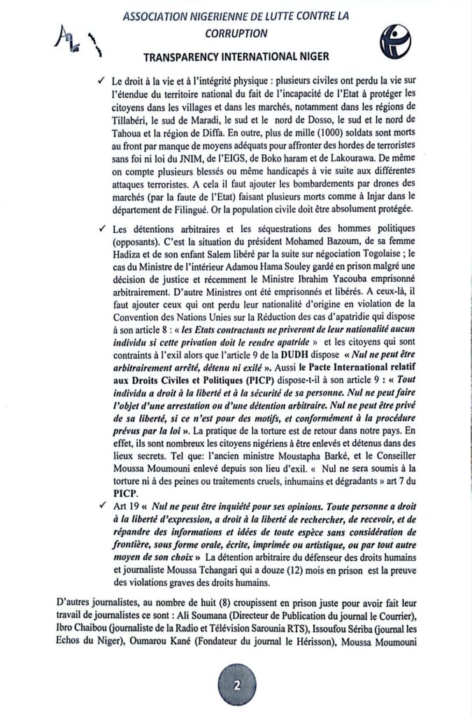 - Art 19 « Nul ne peut être inquiété pour ses opinions. Toute personne a droit à la liberté d’expression, a droit à la liberté de rechercher, de recevoir, et de répandre des informations et idées de toute espèce sans considération de frontière, sous forme orale, écrite, imprimée ou artistique, ou par tout autre moyen de son choix » La détention arbitraire du défenseur des droits humains et journaliste Moussa Tchangari qui a douze (12) mois en prison est la preuve des violations graves des droits humains.