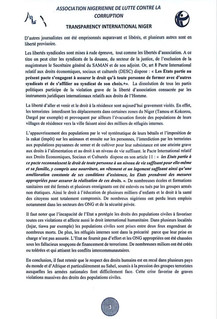 Le Niger n’échappe pas à cette situation. En effet, depuis le 26 juillet 2023 suite au coup d’Etat militaire, les droits de l’homme sont méconnus par les nouvelles autorités malgré leur déclaration du 28 juillet 2023 réaffirmant l’engagement à respecter tous les accords et engagements internationaux.