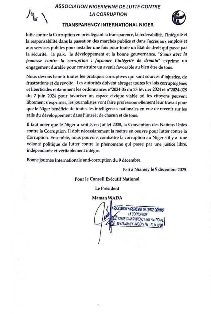 Niamey, le 9 décembre 2025 – À l’occasion de la Journée Internationale de Lutte contre la Corruption, célébrée chaque 9 décembre, l’Association Nigérienne de Lutte contre la Corruption, chapitre national de Transparency International (TI-Niger), a publié un communiqué de presse fort et un message d’alerte. Ces documents rappellent les engagements historiques du Niger et formulent des demandes urgentes pour un retour à l’État de droit, à la transparence et à une lutte effective contre la corruption.